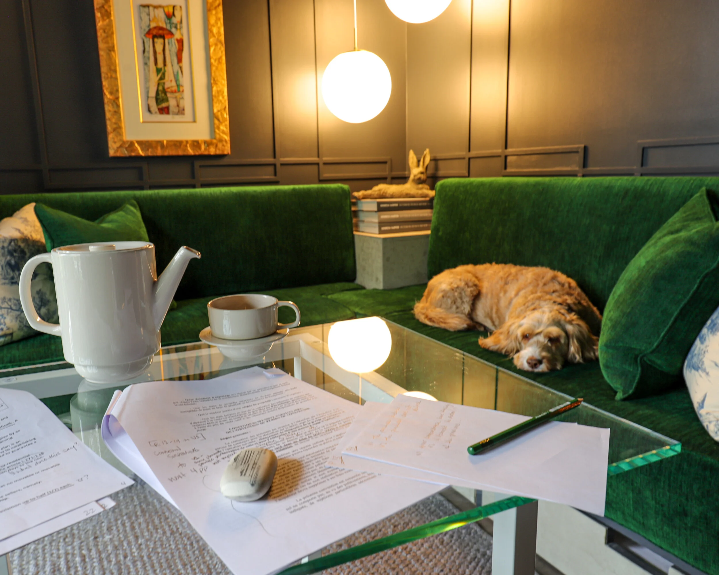 Then the COVID pandemic hit the world, and an aggressive form of cancer hit Hartley and I started to long for those sunny days in the park impatiently counting days and weeks. We found a vet that made house calls who came by every time we called, at any hour of the day or night. Hartley hid his pain that I only noticed in his eyes while looking at some photos of his last days. Hartley passed on a Wednesday morning in July and the little heart that had been beating next to me for the past seven years (but weirdly as long as I can remember) left a hole that will never again be filled. That very week we went back to France with Hartley’s ashes in the back seat. He never sat in a room on his own and I wasn’t about to leave him now. I was running away from something I could not shake, and toward something I could not acquire. Although we were now allowed to enter France at last, we still would not be staying on our property.