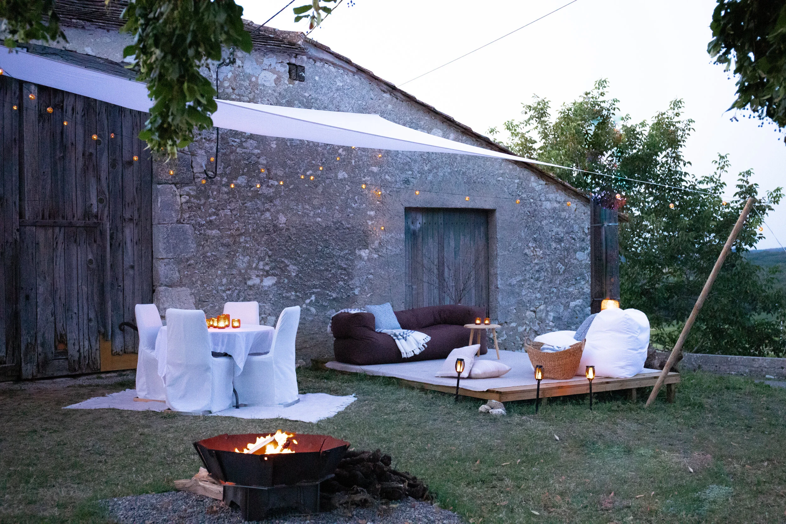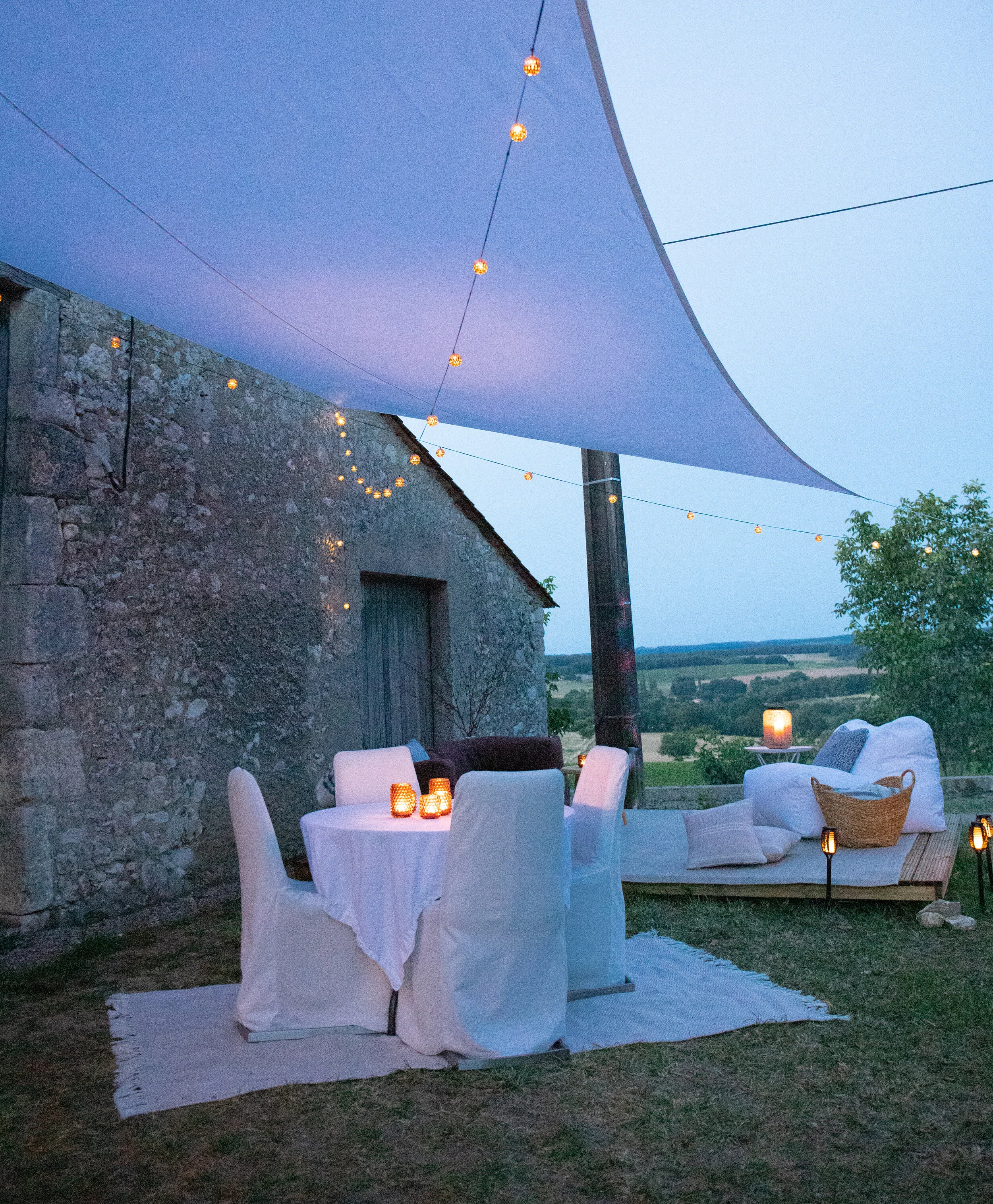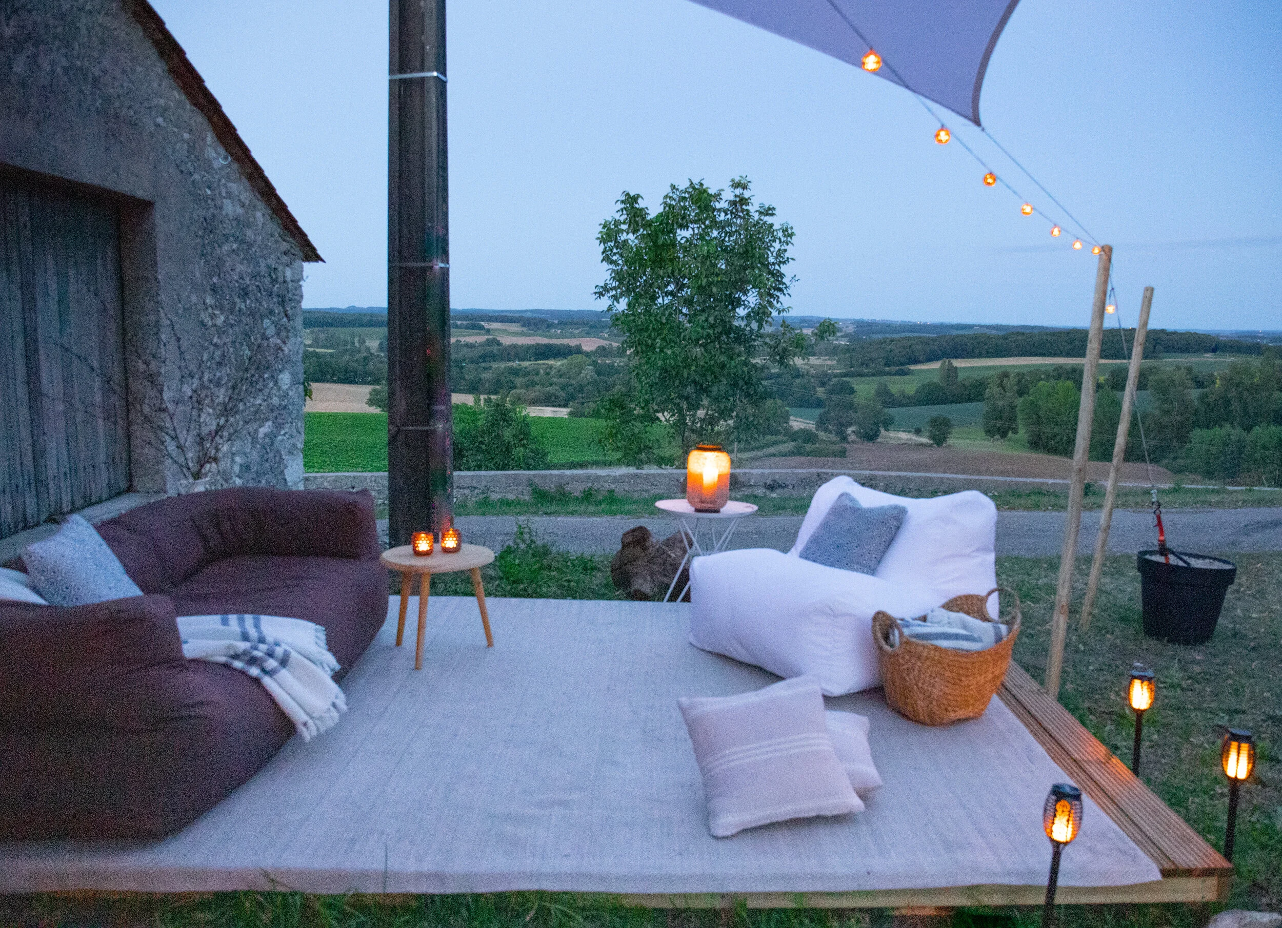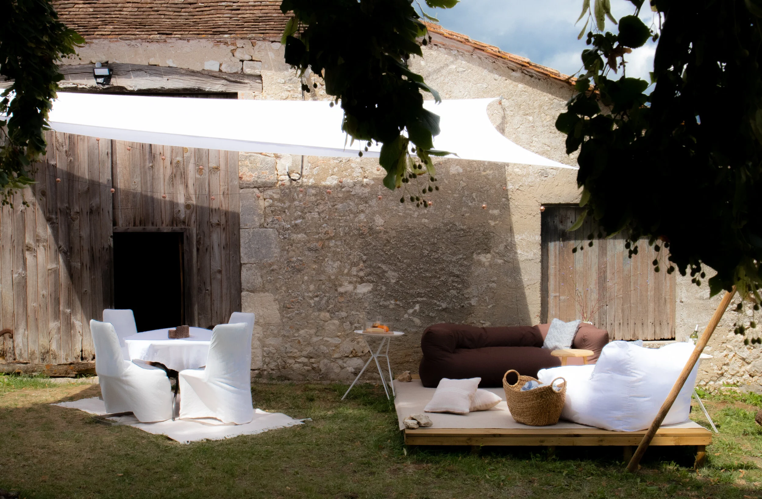 The metal table where I sit next to the pool at the ecurie shakes with each strike of a key on my computer and I use a paper towel for a mouse pad. Normally I would be annoyed at the constant shaking, but I am both rural and French here and so I literally go with the flow. The wine in the glass to my left is shaking with every strike too. Seems we’re all in this together. As I contemplate what I want to write, I procrastinate and read the label on the bottle. It’s from Saint-Emilion, about 40 kilometers from where I sit. I ask Roy what the wine cost. I can’t help it, the constant comparing of every little detail of life here in France to our life in London. Roy makes his thinking face, never one to give an estimate. It always amazes me that he rarely wonders why I am asking a question, he just wants to get it right. 12 Euros he finally announces. 12 Euros. Now that’s something! And the procrastination continues… What would this bottle cost in London, or worse, in New York City? 12 Euros. 12 Euros? And it’s really good. Roy sits across from me reading, we are both too tired to speak. The plans for the house are finally complete and are now in the hands of Monsieur Verduger, our project manager. Work is scheduled to begin in November, so this summer it’s the bell tents we purchased in London and dragged down on a trailer hitched to the back of the car, marking the first time Roy was forced by a power different and stronger than myself to limit his road speed. Our land is still inhospitable and seems to want to spit us out every time we try to move onto it. The brush we cut down over an entire month last October was back with a vengeance this June, looking as if we had never been there. I have been told by more than one person to appreciate how fertile the ground is, but I think I’ll wait to apply that sort of optimism for when we are not growing exclusively weeds. Our fields have been rich in agricultural product for centuries churning out grapevines, and trees of walnut, plum and fig. This summer, our plan is to stay a couple of weeks in our friends’ renovated ecurie until the campsite is in a state suitable to host humans. We have no water or electricity in the area we designated but it has the best view so we are determined to make it work. As luck would have it, Roy can work wonders with a hose which now runs from the old cow barn, across a field, into and out of the old chicken coup, through a hole in the stone wall into the wine-making area of the barn with splitters sending the supply in three directions; to a sink, a shower, and a nozzle for more practical applications. I had managed to re-establish the electrical account weeks ago from London and we expect the electrician next week to install outlets and some basic lighting. For the 15 days we have been in France, we’ve been setting off for the property first thing in the morning and returning to the ecurie in the evenings. My body aches and my brain is in a state of fog. Roy is still working his real job during the days and pushing harder on fumes than I have ever seen him. Today he whacked his head three times on various corners of things, yelped in pain, and kept on working. If he can keep going, so can I. And while I wonder what all the head bashing will do to his mental capacity in the long run, right now it still seems worth it.