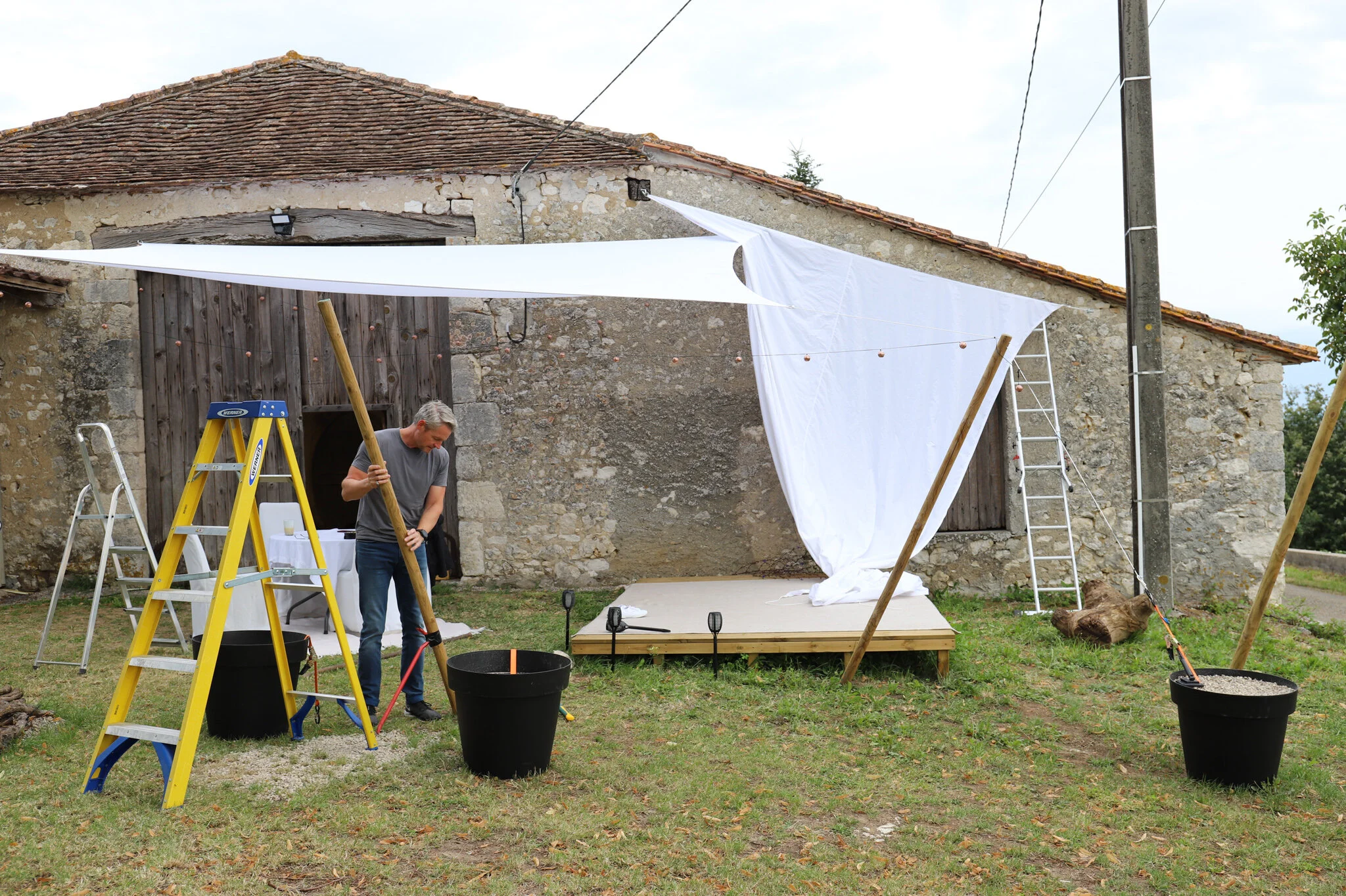 When we first put up the shade sails in the campsite, they stood for a few days. Then the wind came and disconnected some rope. Roy fixed it. That’s determination. One morning after it rained, they filled with water and one corner on each sail was hanging on the ground. Roy put them back up. Determination. Then came the morning all the posts were lying on the ground and the sails were hanging only by the hooks on the barn and we had no choice but to take them down. This would have been the moment to admit defeat. Sails 3. Roy 2, and I thought the game was over. That was until Roy rocked up onto the lawn with fresh new containers and more gravel, and we find ourselves moving a tick beyond determination. Roy puts the sails up again and he’s feeling GOOD. After waiting just a few hours they have the emboldened effrontery now to fall over right in front of our eyes. It’s important to note that by this time, our guests have long left and we ourselves have only one week left of our two-month stay. Surely this must be the end of it.